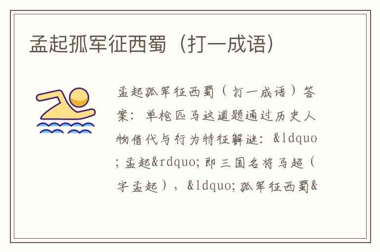 这道题通过历史人物借代与行为特征解谜:“孟起”即三国名将马超(字孟起),“孤军征西蜀”描绘其独自率军攻打西蜀的场景。核心逻辑是“马超(马)+ 孤军(单枪)+ 出征(匹马)”,暗合“单枪匹马”的成语本义——形容独自行动,没有他人协助。