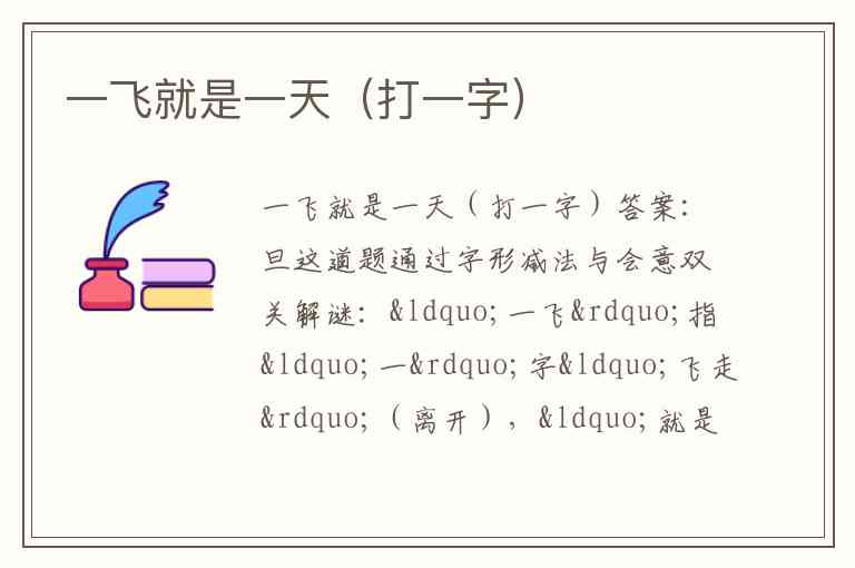 这道题通过字形减法与会意双关解谜:“一飞”指“一”字“飞走”(离开),“就是一天”提示剩余部分为“日”(一天即一日)。核心逻辑是某个字去掉“一”后变为“日”,而“旦”字恰好符合——