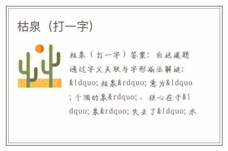 这道题通过字义关联与字形减法解谜:“枯泉”意为“干涸的泉”,核心在于“泉”失去了“水”,“泉”字去掉下方代表水的“氺”(竖钩带四点),剩余部分即为“白”。