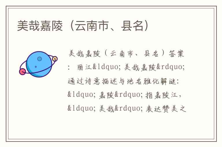 地域与字形的双重契合:丽江作为云南著名县名,其“江”字直接呼应“嘉陵(江)”的水系属性,“丽”与“美哉”形成情感与语义的双重匹配,符合地名谜语“以雅代俗、以景扣名”的创作规律。