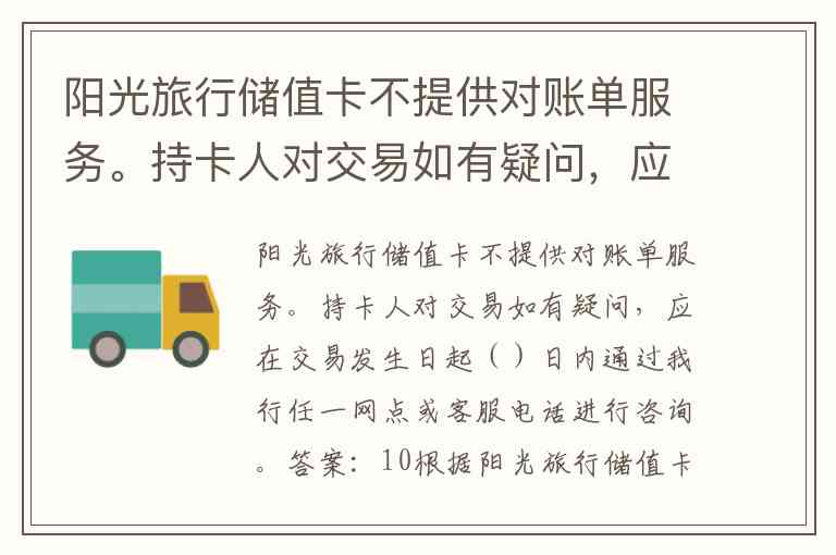 阳光旅行储值卡不提供对账单服务。持卡人对交易如有疑问,应在交易发生日起()日内通过我行任一网点或客服电话进行咨询。