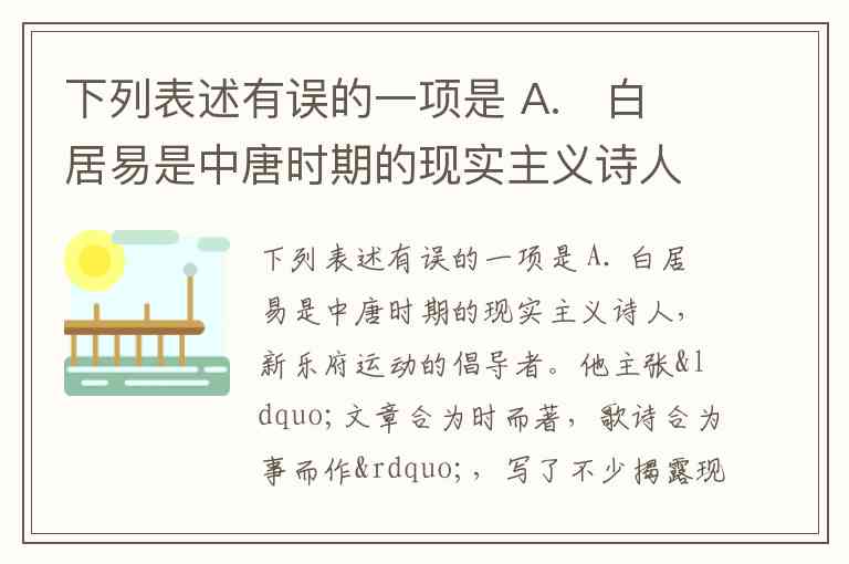 下列表述有误的一项是 A. 白居易是中唐时期的现实主义诗人,新乐府运动的倡导者。他主张“文章合为时而著,歌诗合为事而作”,写了不少揭露现实黑暗的诗篇,语言通俗明白,相传老妪都能听懂。 B. 唐有乐府诗,是按照汉乐府的旧题来写新事的;又有新乐府诗,是不合乐的,是叙事诗,按照所叙事件来定题目,不是仅有乐府的旧题。 C. 《琵琶行》有一明一暗、一实一虚两条结构线索,暗线是琵琶女的演奏和自诉身世,明线是诗人的感受,两条线索的交汇,是诗人与琵琶女“同是天涯沦落人,相逢何必曾相识”的共同感情体验。 D. 《琵琶行》用反衬手法来表现琵琶女的“凄凉”,用昔日的年轻貌美衬托现在的年长色衰,用昔日的门庭若市衬托现在的独守空船,用昔日的“欢笑”衬托如今的辛酸,用夜梦往事衬托孤寂伤感的情怀。