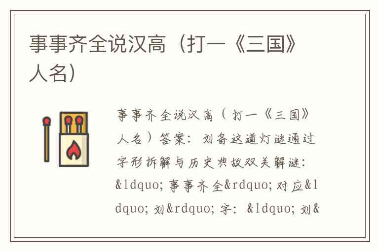 同类谜语印证:另一则灯谜“文武俱全(打三国人名)”同样以“刘”字拆字法指向刘备,佐证“文+刀(武)=刘”的拆解逻辑在三国人物谜中是成熟范式。