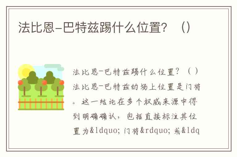 法比恩-巴特兹的场上位置是门将。这一结论在多个权威来源中得到明确确认,包括直接标注其位置为“门将”或“守门员”的资料,以及足球知识题库中将“门将”列为唯一正确选项的试题。
