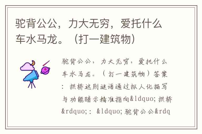 这则谜语通过拟人化描写与功能暗示精准指向“拱桥”:“驼背公公”形象描绘其弯曲的拱形结构,“力大无穷”对应拱桥承重能力(如赵州桥千年承载车马通行),“爱托车水马龙”则直白点出其作为交通枢纽的功能——横跨河流或道路,承载行人车辆往来。