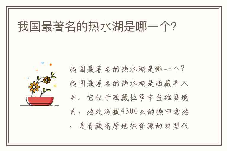 我国最著名的热水湖是西藏羊八井。它位于西藏拉萨市当雄县境内,地处海拔4300米的热田盆地,是青藏高原地热资源的典型代表,以丰富的地热活动和独特的自然景观闻名。