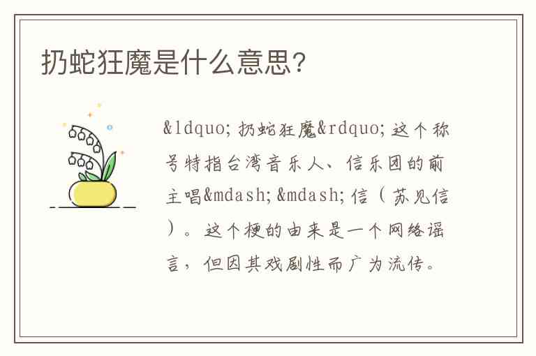 “扔蛇狂魔”是一个源于假新闻的网络梗,特指歌手信。它虽然描述了一个不存在的暴力行为,但因为其巨大的形象反差和戏剧性,成为了网络亚文化中一个经典的、带有戏谑意味的“人物标签”。