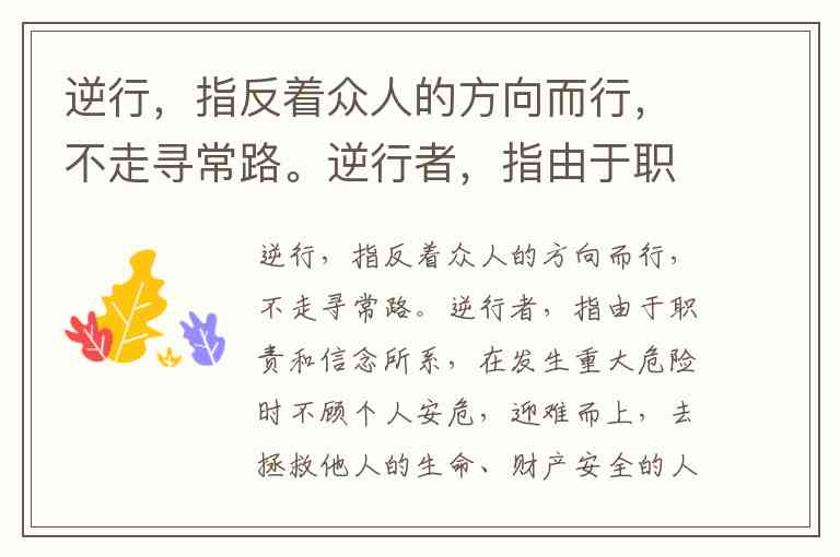 逆行,指反着众人的方向而行,不走寻常路。逆行者,指由于职责和信念所系,在发生重大危险时不顾个人安危,迎难而上,去拯救他人的生命、财产安全的人。顺行者,指在发生重大危险时,顺从大趋势,不特立独行,为最后的胜利提供力所能及帮助的人。 根据上述定义,以下不属于逆行者的是: