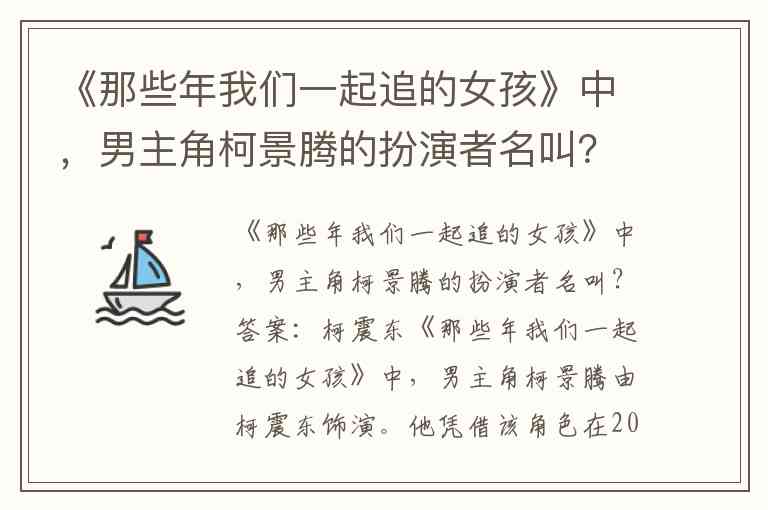 《那些年我们一起追的女孩》中,男主角柯景腾由柯震东饰演。他凭借该角色在2011年崭露头角,影片中柯景腾的青春莽撞与对沈佳宜(陈妍希饰)的懵懂爱恋,成为许多观众的“青春回忆”。柯震东当时以本名“柯家凯”出道,艺名“柯震东”因该片广为人知,其自然的表演风格贴合角色的少年感,使柯景腾这一形象成为台湾青春片的经典角色之一。