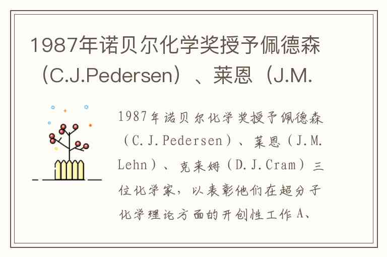 1987年诺贝尔化学奖确实授予了佩德森(C.J.Pedersen)、莱恩(J.M.Lehn)和克来姆(D.J.Cram)三位化学家,以表彰他们在超分子化学领域的开创性工作。这一结论有明确的文献依据: