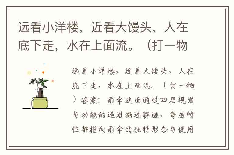 四层描述从远观形态到近观细节,从空间关系到功能特性,层层递进锁定“雨伞”:建筑感(洋楼)→ 形态感(馒头)→ 使用场景(人在底下)→ 核心功能(水在上面流),每个意象都与雨伞的日常使用体验高度重合,最终形成“形态-功能-场景”的完整闭环。