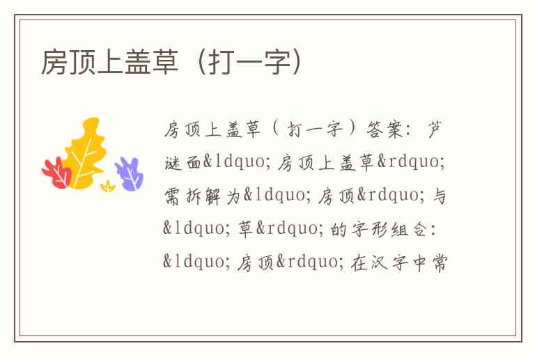 谜面“房顶上盖草”需拆解为“房顶”与“草”的字形组合:“房顶”在汉字中常用“户”表示(“户”本义为房屋入口,引申为房屋),“草”则以“艹”(草字头)为符号。将“艹”置于“户”之上,恰好组成“芦”字。