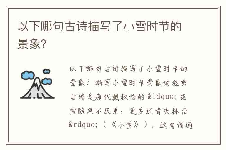 描写小雪时节景象的经典古诗是唐代戴叔伦的 “花雪随风不厌看,更多还肯失林峦”(《小雪》)。这句诗通过轻盈雪花与山林的互动,精准捕捉了小雪“初雪未盛、如花瓣飘洒”的节气特征:“花雪”形容雪片细碎如落花,“不厌看”点出小雪不似大雪的压迫感,反而有种惹人驻足的轻柔之美;“失林峦”则描绘雪花飘落山林、渐隐峰峦轮廓的朦胧画面,恰是小雪“雪量小、落地易化”的气候特点。