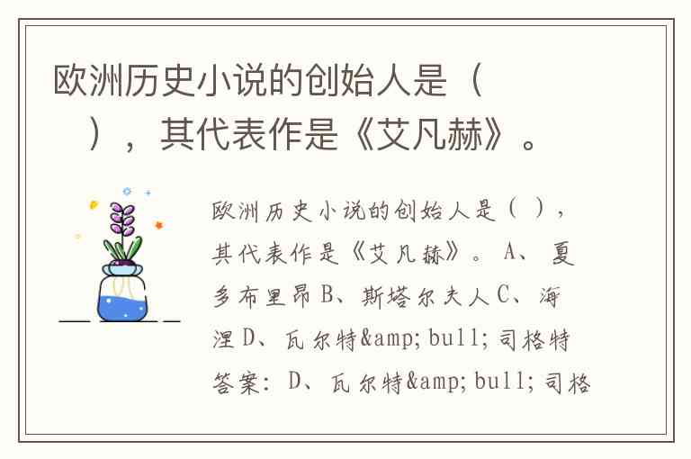 欧洲历史小说的创始人是( ),其代表作是《艾凡赫》。 A、 夏多布里昂 B、斯塔尔夫人 C、海涅 D、瓦尔特•司格特
