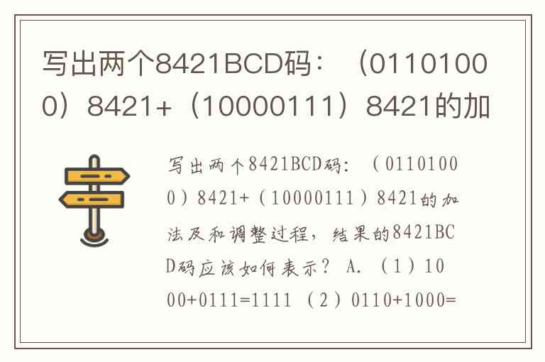 8421BCD码以4位二进制表示1位十进制数,加法时需按“分组相加→判断是否超9→超9加6调整→处理进位”四步进行。题目中两个BCD码分别为 (0110 1000)(68)和 (1000 0111)(87),需分高低4位(十位、个位)独立计算: