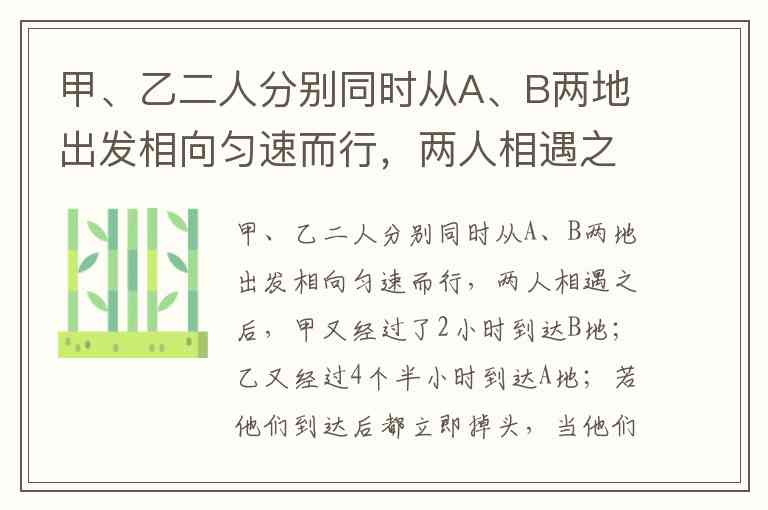 甲、乙二人分别同时从A、B两地出发相向匀速而行,两人相遇之后,甲又经过了2小时到达B地;乙又经过4个半小时到达A地;若他们到达后都立即掉头,当他们再次相遇时,距他们第一次相遇经过了多少小时?