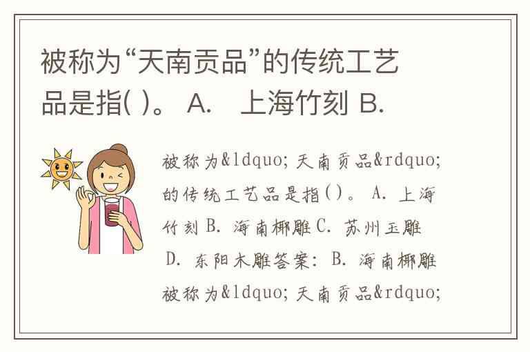 被称为“天南贡品”的传统工艺品是指( )。 A. 上海竹刻 B. 海南椰雕 C. 苏州玉雕 D. 东阳木雕
