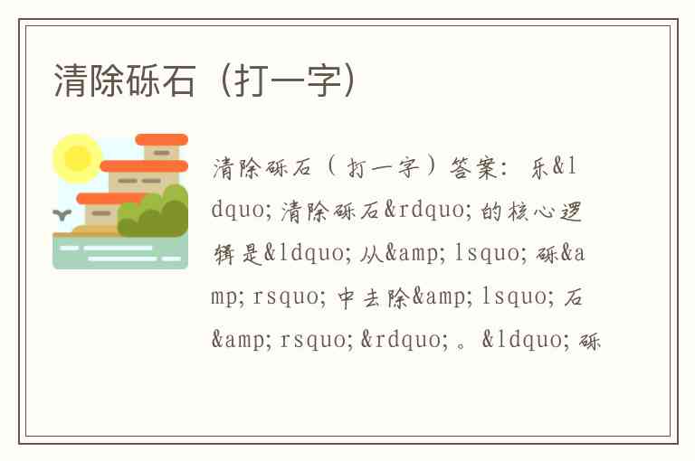“清除砾石”的核心逻辑是“从‘砾’中去除‘石’”。“砾石”的“砾”由“石”(石字旁,代表石头)和“乐”组成,“清除”即“去掉石字旁”,仅剩“乐”字,字形拆解直接对应谜面描述。