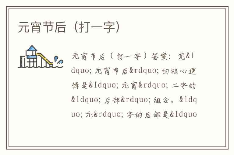 “元宵节后”的核心逻辑是“元宵”二字的“后部”组合。“元”字的后部是“兀”,“宵”字的后部是“宀”(宝盖头,原字为“宵夜”的“宵”,上为“宀”、下为“肖”,后部即上半部分),二者组合为“完”。