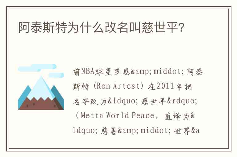 传达积极理念:新名字"Metta World Peace"中的"Metta"源于古印度语,意为"善"。阿泰斯特希望新名字能唤起公众(尤其是孩子们)对世界和平与善念的重视。