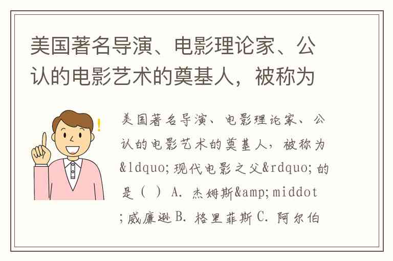 美国著名导演、电影理论家、公认的电影艺术的奠基人,被称为“现代电影之父”的是( ) A. 杰姆斯·威廉逊 B. 格里菲斯 C. 阿尔伯特·史密斯 D. 爱森斯坦