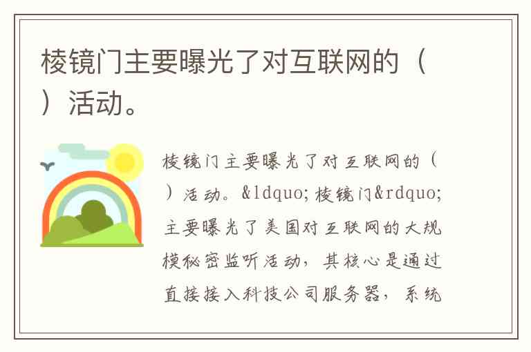 “棱镜门”主要曝光了美国对互联网的大规模秘密监听活动,其核心是通过直接接入科技公司服务器,系统性搜集全球用户数据与通信内容。
