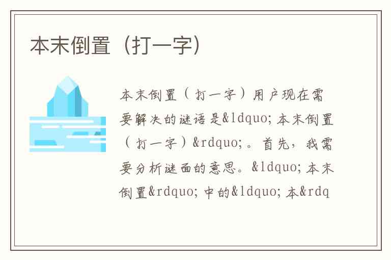 再想,“本”和“末”都是“木”字,只是横的位置不同。“本末倒置”就是把“本”和“末”的横的位置颠倒,也就是“本”变成“末”,“末”变成“本”,但这是两个字,谜语要一个字,所以可能是取“本”和“末”的共同点“木”,然后把它们的区别(横)合并,形成“米”?“米”是木加四横,但不对。