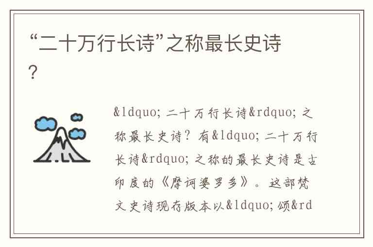 有“二十万行长诗”之称的最长史诗是古印度的《摩诃婆罗多》。这部梵文史诗现存版本以“颂”(每组对句为一颂)为单位,共约10万颂,合计20万诗行,在《格萨尔王传》被系统整理前,长期被公认为世界最长史诗。