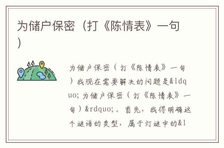 我现在需要解决的问题是“为储户保密(打《陈情表》一句)”。首先,我得明确这个谜语的类型,属于灯谜中的“会意谜”,也就是根据谜面的意思来联想谜底,而谜底需要是《陈情表》中的一句原文。