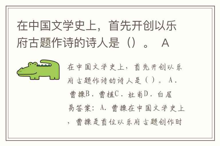 在中国文学史上,首先开创以乐府古题作诗的诗人是()。 A . 曹操B . 曹植C . 杜甫D . 白居易