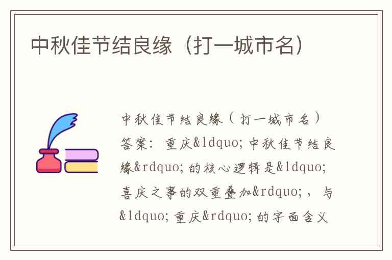 “中秋佳节结良缘”的核心逻辑是“喜庆之事的双重叠加”,与“重庆”的字面含义“双重喜庆”形成精准对应——“中秋佳节”为传统喜庆节日,“结良缘”是人生重大喜事,二者叠加即为“双重喜庆”,谐音对应城市名“重庆”。