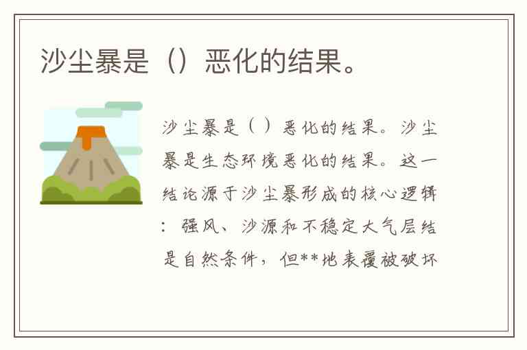 这一结论源于沙尘暴形成的核心逻辑:强风、沙源和不稳定大气层结是自然条件,但**地表覆被破坏导致的“沙源裸露”**是环境恶化的直接体现。根据研究,人为过度放牧、滥伐森林、垦荒破坏地面植被,会扰动地表结构,形成大面积沙漠化土地,直接加速沙尘暴的形成和发育。例如,我国北方强和特强沙尘暴的发生频数自20世纪50年代以来持续增加,从50年代的5次上升到90年代的23次,这与“区域干燥导致土壤水分减少和人为干扰活动加强、地表覆被总体恶化”密切相关。