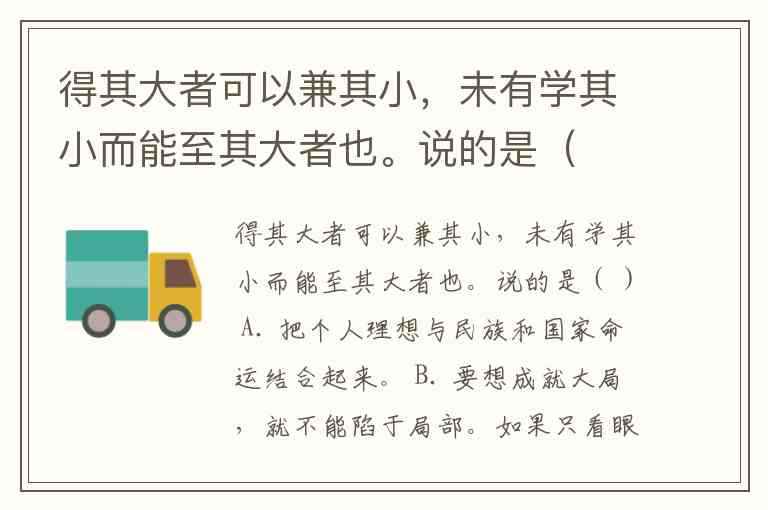 得其大者可以兼其小,未有学其小而能至其大者也。说的是( ) A. 把个人理想与民族和国家命运结合起来。 B. 要想成就大局,就不能陷于局部。如果只看眼前、只论得失、只记自我,就可能纠缠在具体的事务之中不得脱身,从而因小失大;相反,如果能看到大势、大局和大道,以大胸襟、大眼界包容小问题、小矛盾,所谓的“小”也自然能处理好了。 C. 把人生理想融入国家和民族的事业中,投身于实现国家和民族的中国梦。 D. 在实现民族复兴的中国梦的洪流中发挥个人的才华和智慧,才能不断地丰富自己、完善自己、发展自己,才能更好地实现个人的梦想。