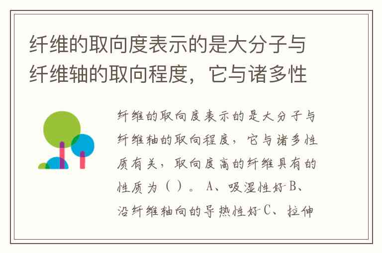 纤维的取向度表示的是大分子与纤维轴的取向程度,它与诸多性质有关,取向度高的纤维具有的性质为()。 A、吸湿性好 B、沿纤维轴向的导热性好 C、拉伸强度高 D、双折射率低