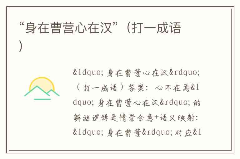 “身在曹营心在汉”的解谜逻辑是情景会意+语义映射:“身在曹营”对应“身在此处”,“心在汉”对应“心不在此处”,合为“心不在焉”。“焉”为文言虚词,表“这里”,“心不在焉”即“心思不在这里”,精准概括了谜面中“身体与内心分离”的核心矛盾。