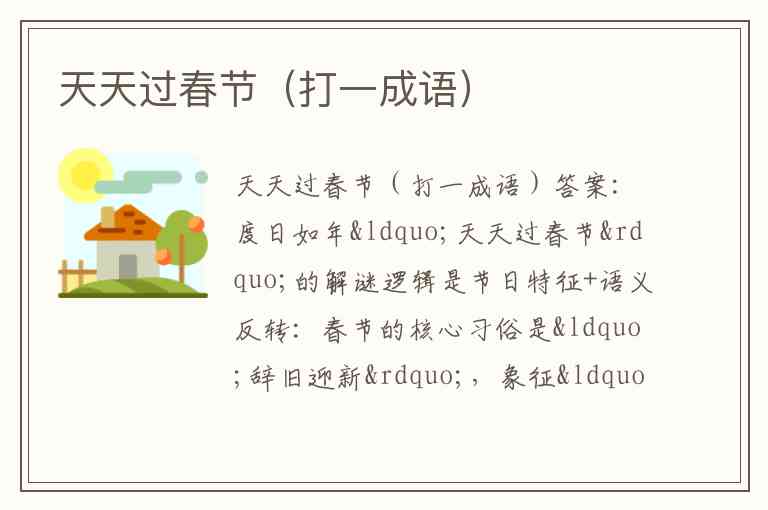 这种“节日符号→时间概念→成语语义”的转化,体现了谜语“以巧取胜”的特点:用“春节=年”的文化共识,构建“每日=年”的荒诞等式,最终落点在“度日如年”的经典成语上,让谜底既在意料之外,又在情理之中。