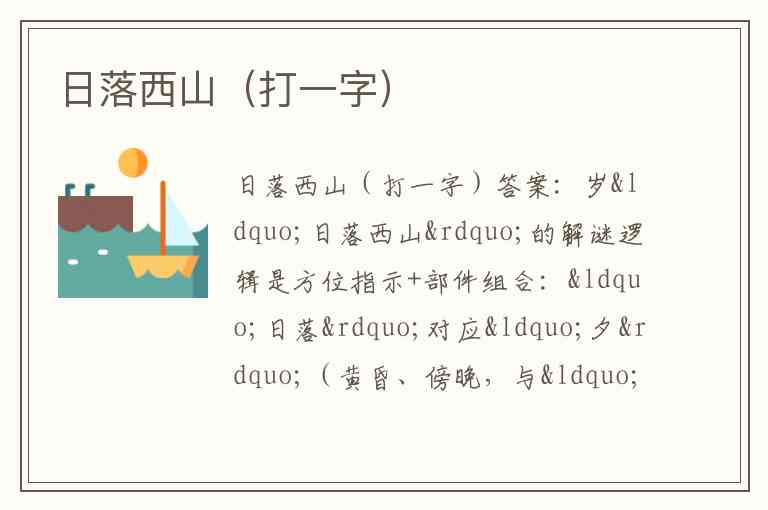 “日落西山”的解谜逻辑是方位指示+部件组合:“日落”对应“夕”(黄昏、傍晚,与“日”的时间概念相关),“西山”提示“山”的位置在“西”边,即“夕”字的右侧,二者组合成左右结构的“岁”字。