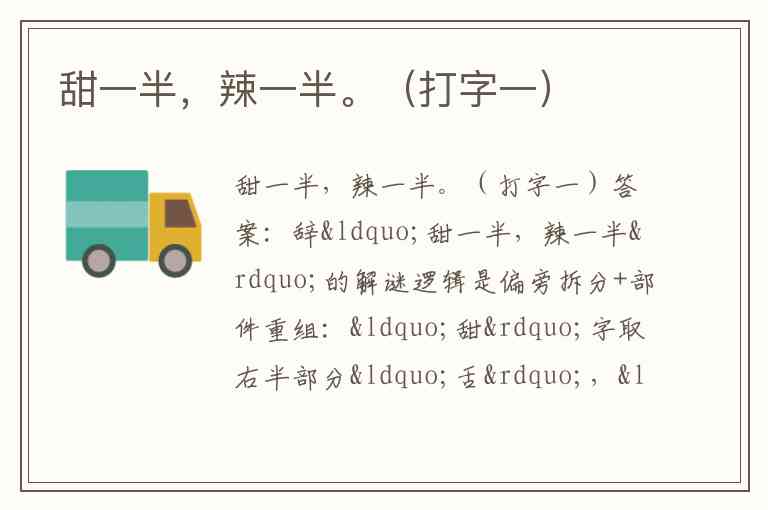 “甜一半,辣一半”的解谜逻辑是偏旁拆分+部件重组:“甜”字取右半部分“舌”,“辣”字取左半部分“辛”,二者组合成左右结构的“辞”字。