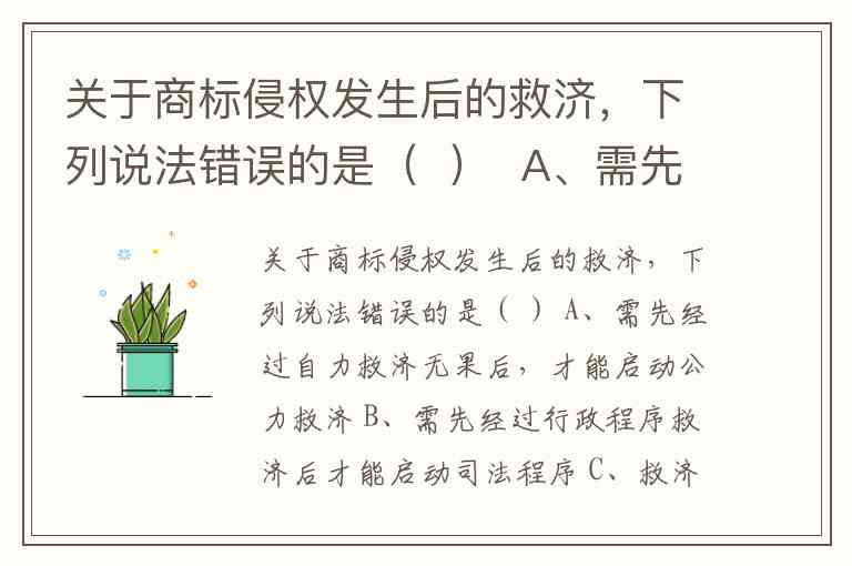 商标侵权救济的核心原则是“多元救济、自主选择”,《中华人民共和国商标法》第六十条明确规定,当事人可通过协商、行政处理或司法诉讼解决纠纷,无先后顺序限制。以下结合法律条文具体分析错误选项: