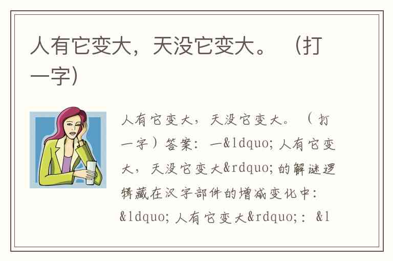 “人有它变大”:“人”字加上“一”(谜底),便成为“大”——“人+一=大”,实现“变大”;