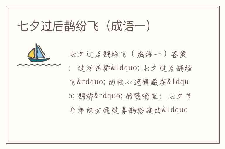 “七夕过后鹊纷飞”的核心逻辑藏在“鹊桥”的隐喻里:七夕节牛郎织女通过喜鹊搭建的“鹊桥”相会,节日过后,完成使命的喜鹊四散飞走,原本连接两岸的“桥”也随之消失——这恰如“过河拆桥”的字面意象:“过河”对应牛郎织女借鹊桥相会的行为,“拆桥”对应鹊飞桥散的结果。