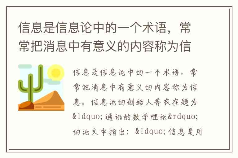 信息是信息论中的一个术语,常常把消息中有意义的内容称为信息。信息论的创始人香农在题为“通讯的数学理论”的论文中指出:“信息是用来消除随机不定性的东西”。以下内容是信息的有: