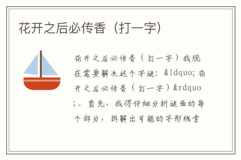 我现在需要解决这个字谜:“花开之后必传香(打一字)”。首先,我得仔细分析谜面的每个部分,拆解出可能的字形线索。