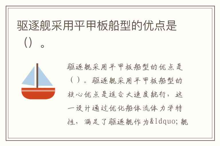 驱逐舰采用平甲板船型的核心优点是适合大速度航行,这一设计通过优化船体流体力学特性,满足了驱逐舰作为“舰队突击力量”对高速机动的核心需求。