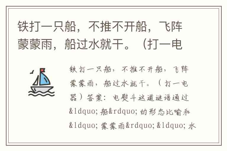 这道谜语通过“船”的形态比喻和“蒙蒙雨”“水就干”的功能描述,指向电熨斗这一日常电器。