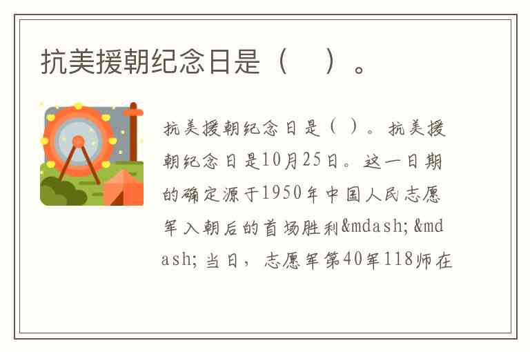 抗美援朝纪念日是10月25日。这一日期的确定源于1950年中国人民志愿军入朝后的首场胜利——当日,志愿军第40军118师在朝鲜两水洞地区伏击南朝鲜军,歼灭其一个加强营及炮兵中队,以“拦头、截尾、斩腰”战术取得入朝首战大捷,标志着抗美援朝战争正式打响。