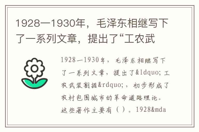 1928—1930年,毛泽东相继写下**《中国的红色政权为什么能够存在?》《井冈山的斗争》《星星之火,可以燎原》**三篇重要著作,系统提出“工农武装割据”思想,标志着农村包围城市革命道路理论的初步形成。