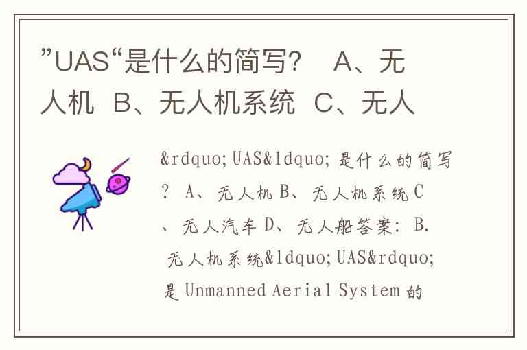 ”UAS“是什么的简写? A、无人机 B、无人机系统 C、无人汽车 D、无人船