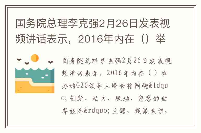 国务院总理李克强2月26日发表视频讲话表示,2016年内在()举办的G20领导人峰会将围绕“创新、活力、联动、包容的世界经济”主题,凝聚共识,推进合作,采取行动。