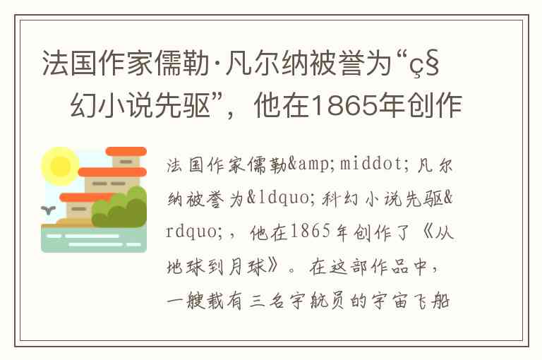 法国作家儒勒·凡尔纳被誉为“科幻小说先驱”,他在1865年创作了《从地球到月球》。在这部作品中,一艘载有三名宇航员的宇宙飞船,被一门巨大的大炮发射到月球上。上个世纪美国阿波罗计划的登月方案,就是在这部小说的基础上设计出来。凡尔纳的一生创作了大量的优秀文学作品,以《在已知和未知的世界中的奇异旅行》为总名,主要代表作有《格兰特船长的儿女》、《海底两万里》、《神秘岛》,以及《气球上的五星期》《地心游记》等。100多年来,凡尔纳的作品对科幻文学流派有着重要的影响,所以凡尔纳也被称作“科幻小说之父”。